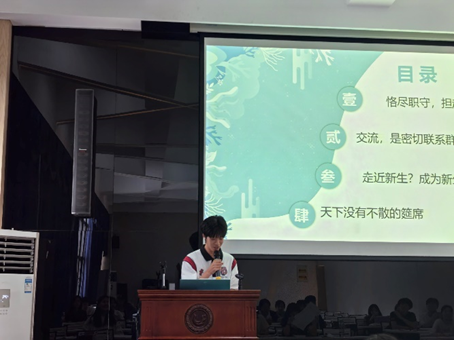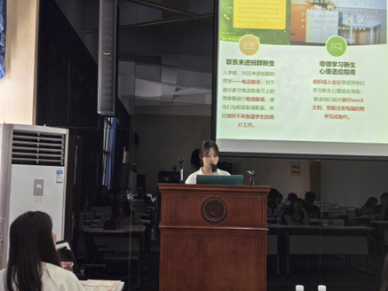 李佳骏等9位助辅与文楠等9位助教依次进行答辩,他们分别从工作方法、工作成效、工作反思与感悟等方面介绍了过去一年的新生班级建设情况以及个人工作概况。