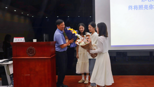 (图为学生代表向校党委常委许传华教授献花)