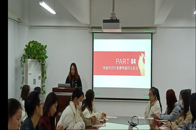 预备党员代表唐怿璇现场讲述自己的入党历程,并郑重向党组织承诺:将时刻谨记习近平总书记的教诲,肩负起青年党员的时代使命,以实际行动彰显学生党员的责任与担当,将青春热血浇灌在为人民谋幸福,为中华民族谋复兴的伟大事业上。