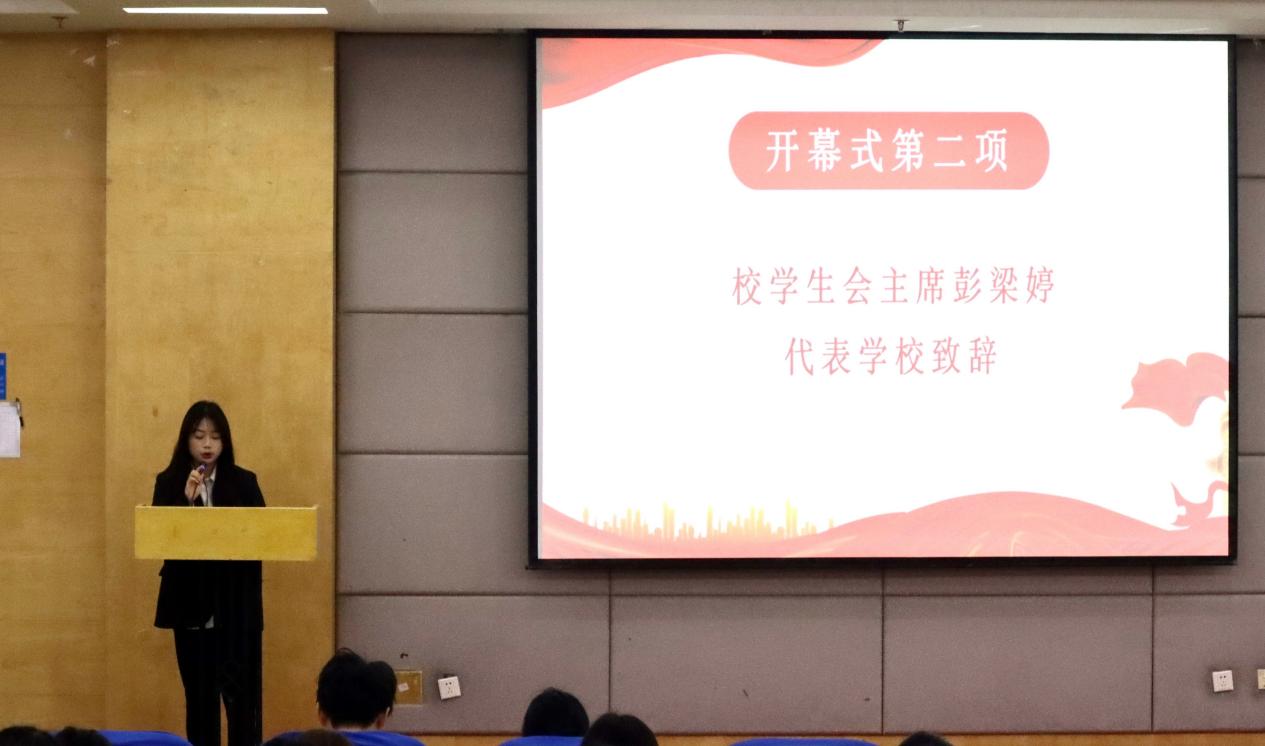 (图为校学生会代表彭梁婷致辞)