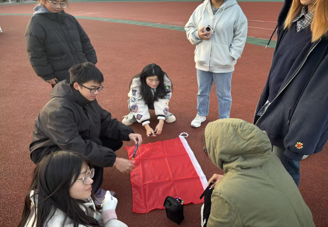 11月26日早晨,各领队维持现场秩序,带领小组成员跑操一圈,进行简单的自我介绍后,由小组成员采取接龙制的方式绘制队旗,拉近了干事之间的距离。