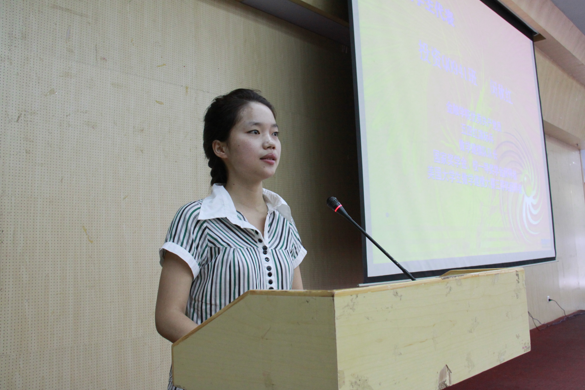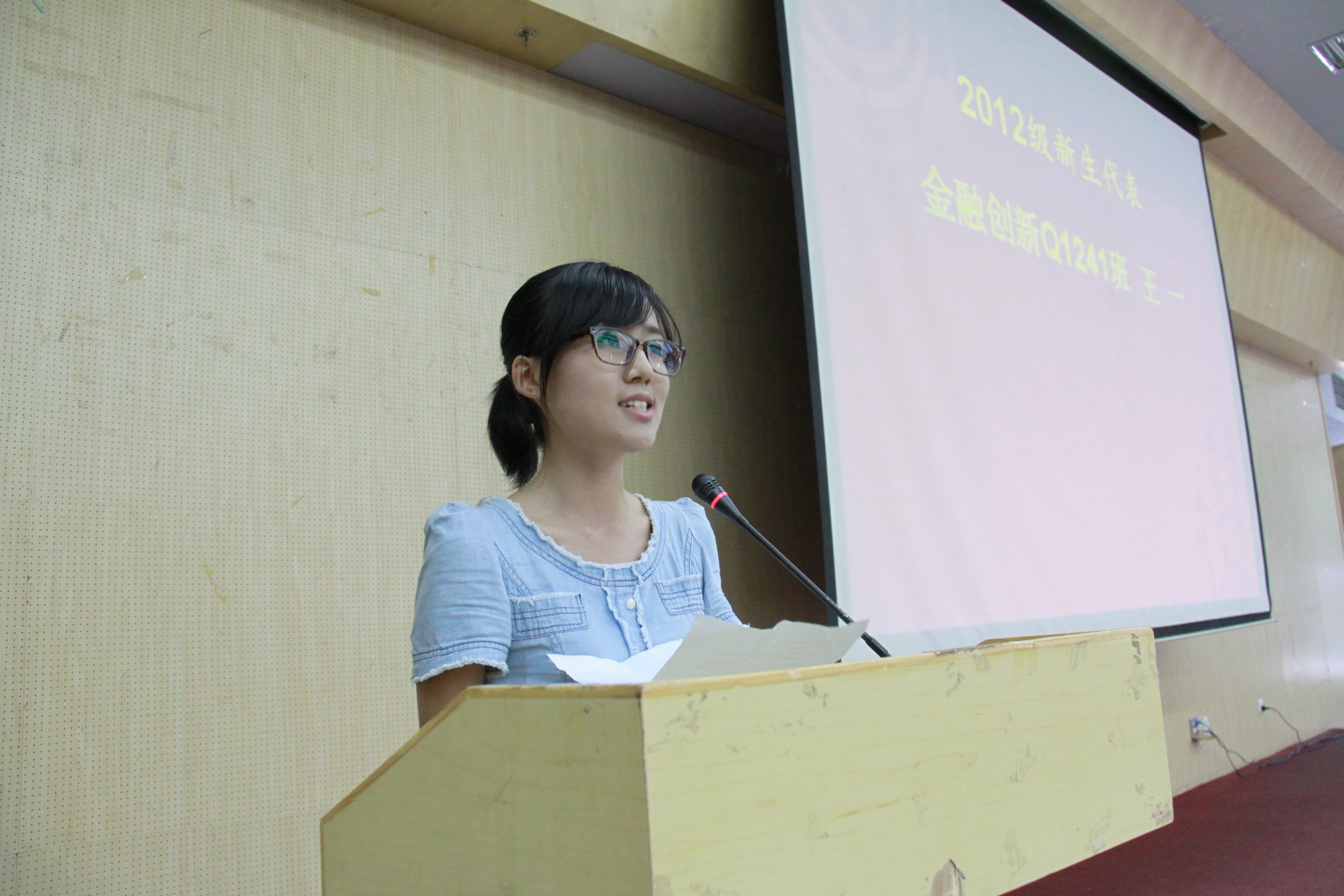 接着,2138CC太阳集团国家奖学金获得者、美国大学生数学建模大赛三等奖获得者、三好学生标兵、五四红旗标兵、优秀学生党员、投资Q0941班闵秋红同学作为优秀老生代表,作了精彩发言。发言中,她结合自身的大学学习生活经验,为全体2012级新生传授了宝贵的经验,并就合理规划大学生活提出了中肯的建议。而2012级金融学拔尖创新班王一同学作为新生代表也郑重承诺,一定要好好学习、合理规划,并号召全体新生积极用实际行动去践行自己的诺言、回报母校。