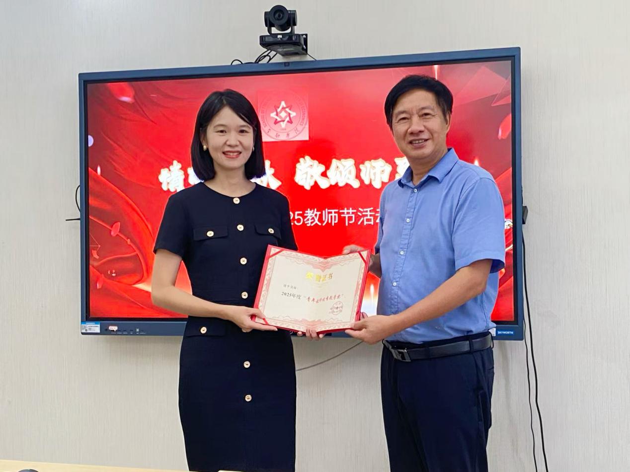 许传华为“青年教师优秀教学奖获得者吴双老师颁发荣誉证书