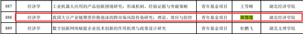 (撰稿人:姬姣姣)2025年9月25日,教育部社科司公布了2025年度教育部人文社会科学研究一般项目评审结果。我院黄慧莲老师主持申报的课题《我国大豆产业链期货价格泡沫的跨市场风险传染研究:理论、效应与防控》获批青年基金项目立项。该项目的成功立项,不仅体现了我院有组织科研的持续推进,也彰显了我院教师在科研工作中的辛勤付出和卓越贡献。