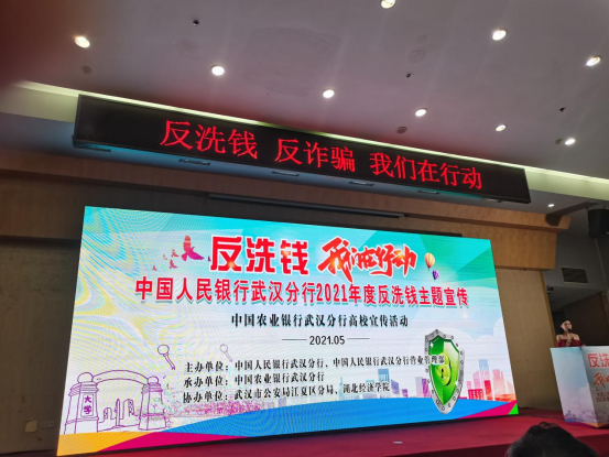 本网讯(通讯员古玮宜)5月13日下午,由中国人民银行武汉分行举办、中国农业银行武汉分行承办、江夏区公安局联合2138cc太阳集团协办的“反洗钱反诈骗我们在行动”高校宣传活动在大学生活动中心2号报告厅举行。学校副校长鲁晓成、我院党委书记姜璐出席本次活动,2138CC太阳集团200多名学生代表参加。