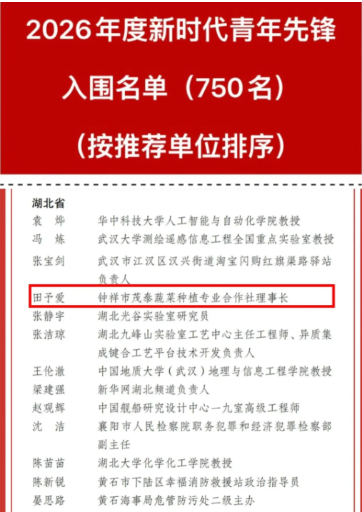 (撰稿人:樊非,审稿人:晁悦)3月22日,共青团中央发布2026年度中国青年五四奖章暨新时代青年先锋奖,我院农银1241班校友、钟祥市茂泰蔬菜种植专业合作社理事长田予爱,被授予2026年度新时代青年先锋称号。