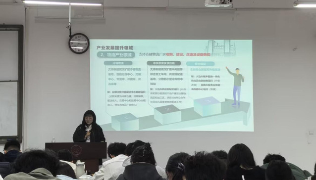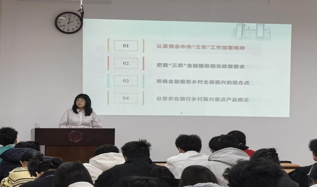 讲座中,胡丹老师首先带领同学们认真领会中共中央关于“三农”工作的最新部署精神,系统梳理了金融服务乡村振兴的相关政策要求。她指出,金融是乡村全面振兴的重要支撑,青年学子要主动关注国家战略,找准金融服务与“三农”需求的结合点。随后,胡老师结合农业银行在湖北及全国的服务实践,详细介绍了支持乡村振兴的重点产品与创新模式,包括惠农e贷、农村集体经济组织贷款、农业产业链金融等,并以实际案例展示了金融活水如何精准滴灌田间地头。
