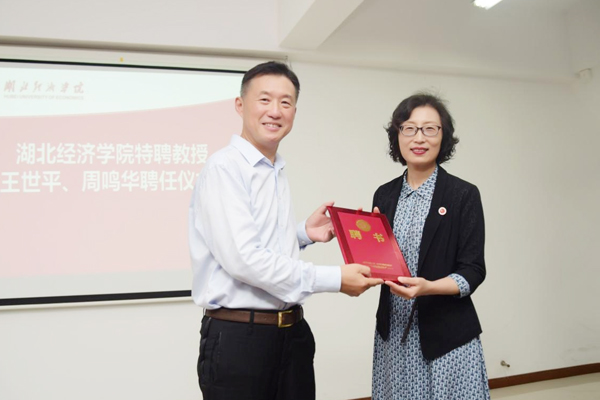 方洁对王世平、周鸣华受聘我校特聘教授表示衷心感谢。她分享了今年学校的“三大喜事”——成功举办组建20周年校庆、新增6个国家级一流专业、碳排放权交易省部共建协同创新中心获批,并用“既老又新”“经院现象”“厚积薄发”“顶天立地”“一二三四”等关键词概括介绍了学校的发展历程、发展成就、发展目标。她指出,王教授和周教授拥有丰富的证券行业工作经验和企业资源,两位教授的加盟将会进一步提升学校与华英证券有限责任公司校企合作、产教融合的水平, 为教师队伍提升实践能力提供了新的平台,必将进一步助推“三有三实”人才培养质量。