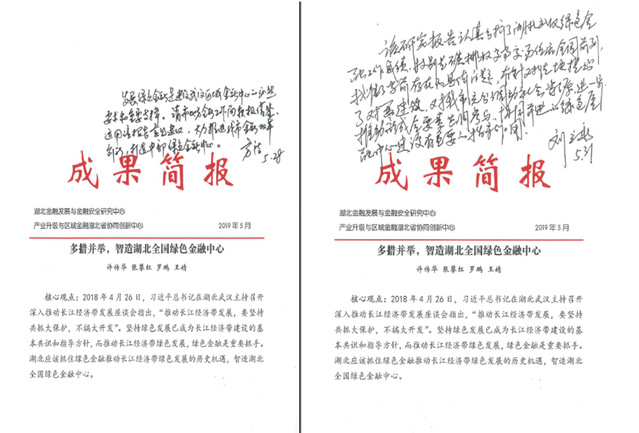 5月31日,武汉市金融工作局局长刘立新根据批示,充分肯定“该研究报告认真分析了湖北地区绿色金融工作成绩,特别是碳排放交易位居全国前列,找准了当前存在的具体问题,有针对性地提出了对策建议,对我市充分调动社会资源,进一步推动形成全要素共同参与,协同并进的绿色金融中心建设有重要的指导作用。”