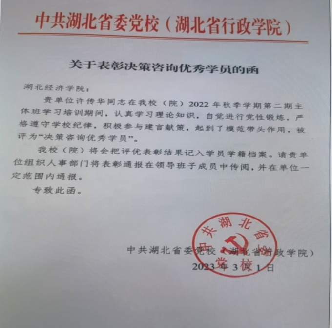 近日,学校收到了中共湖北省委党校《关于表彰决策咨询优秀学员的函》。在函件中指出,许传华同志在中共湖北省委党校2022年秋季学期第二期主体班学习培训期间,认真学习理论知识,自觉进行党性锻炼,严格遵守学校纪律,积极参与建言献策,起到了模范带头作用,被评为“决策咨询优秀学员”。