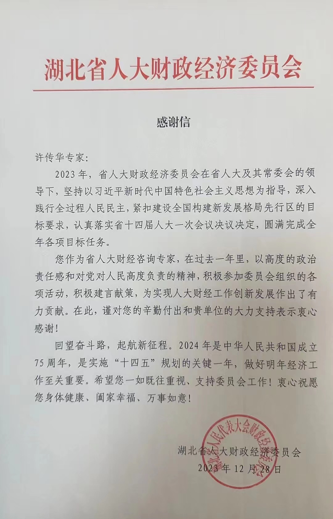 近日,学校收到了湖北省人大财政委员会的感谢信,感谢许传华专家(湖北省人大财政经济委员会财经咨询专家)。在感谢信中表明,“您作为省人大财经咨询专家,在过去一年里,以高度的政治责任感和对党对人民高度负责的精神,积极参加委员会组织的各项活动,积极建言献策,为实现人大财经工作创新发展作出了有力贡献。在此,谨对您的辛勤付出和贵单位的大力支持表示衷心感谢!”